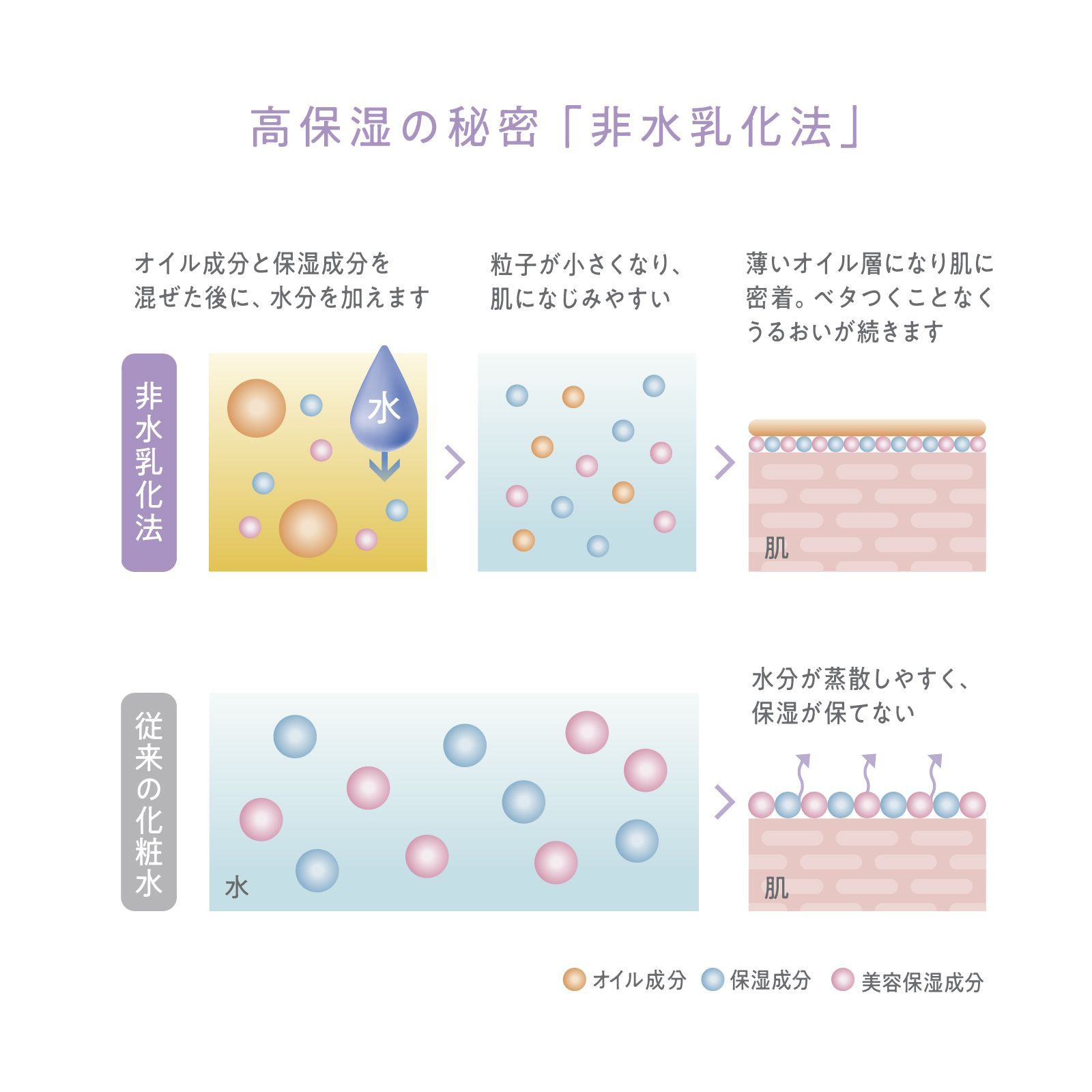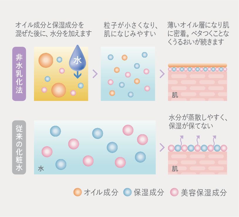通常の乳化法と違い、水をほとんど使わない非水乳化法。オイルの粒子が細かいので肌なじみがよく、早く深く浸透して角質のすみずみまでうるおいを届けます。さらに肌表面では、微細なオイルがベールをつくり、長時間うるおいを閉じ込めて逃しません。