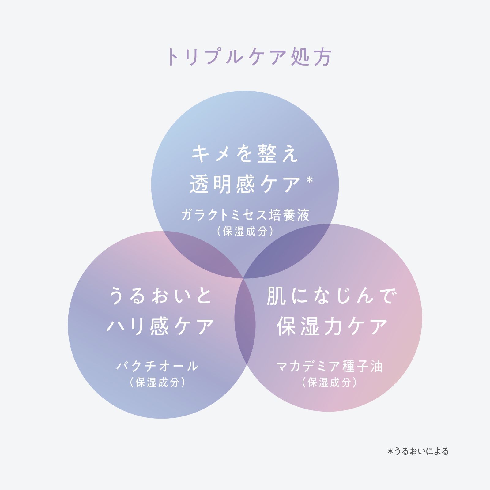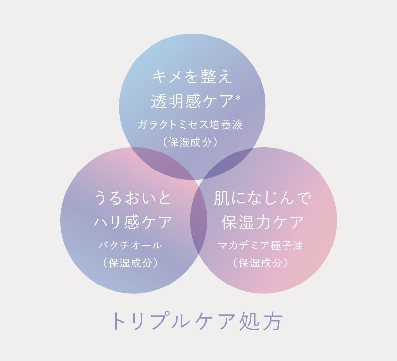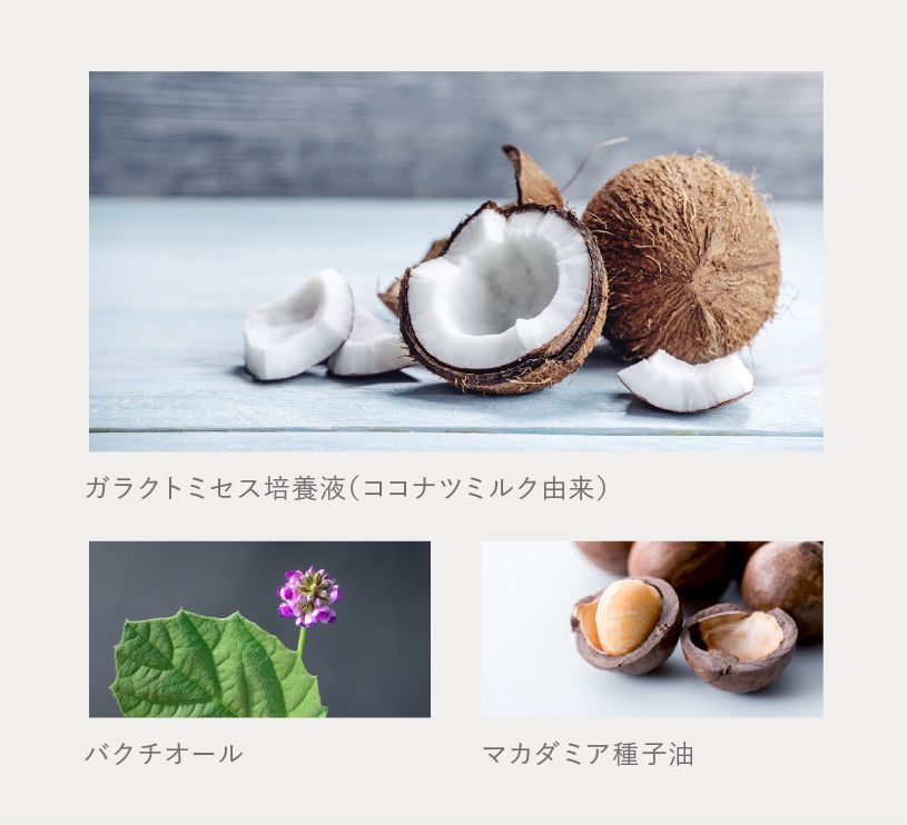 トリプルケア処方で配合された3つの美容成分はすべて自然由来。ガラクトミセスは、動物由来ではなく植物由来のミルク成分にこだわりました。バクチオールもマカダミア種子油も植物から抽出された天然成分。高い美容効果を持ちながら、刺激が少ない処方を目指しました。