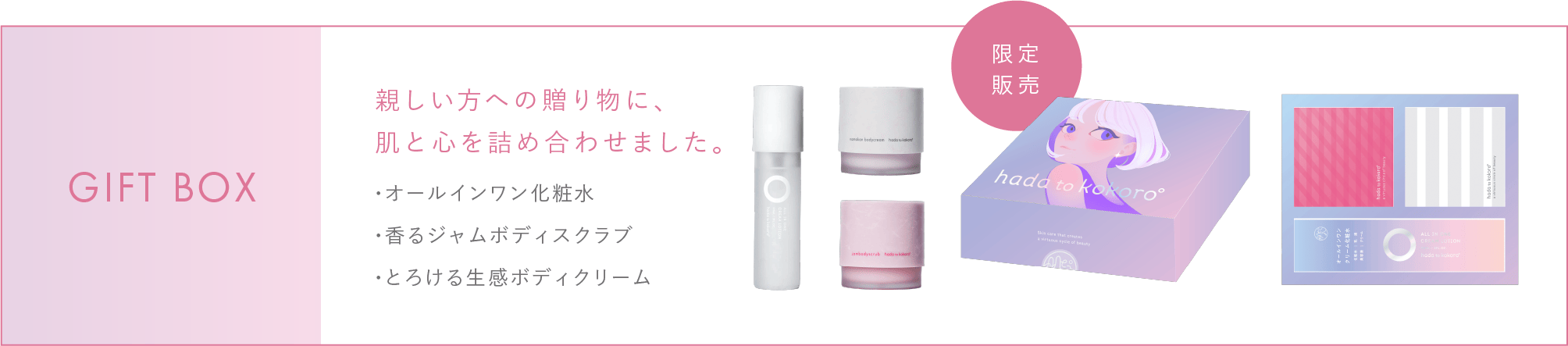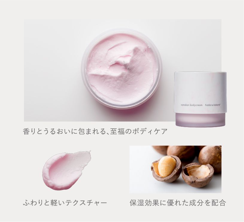 ふんわりとした肌あたりで、つけるとなめらかにとろける、やさしいスフレ感。ガラクトミセス培養液とマカデミア種子油を配合し、うるおい続くハリツヤボディに導きます。