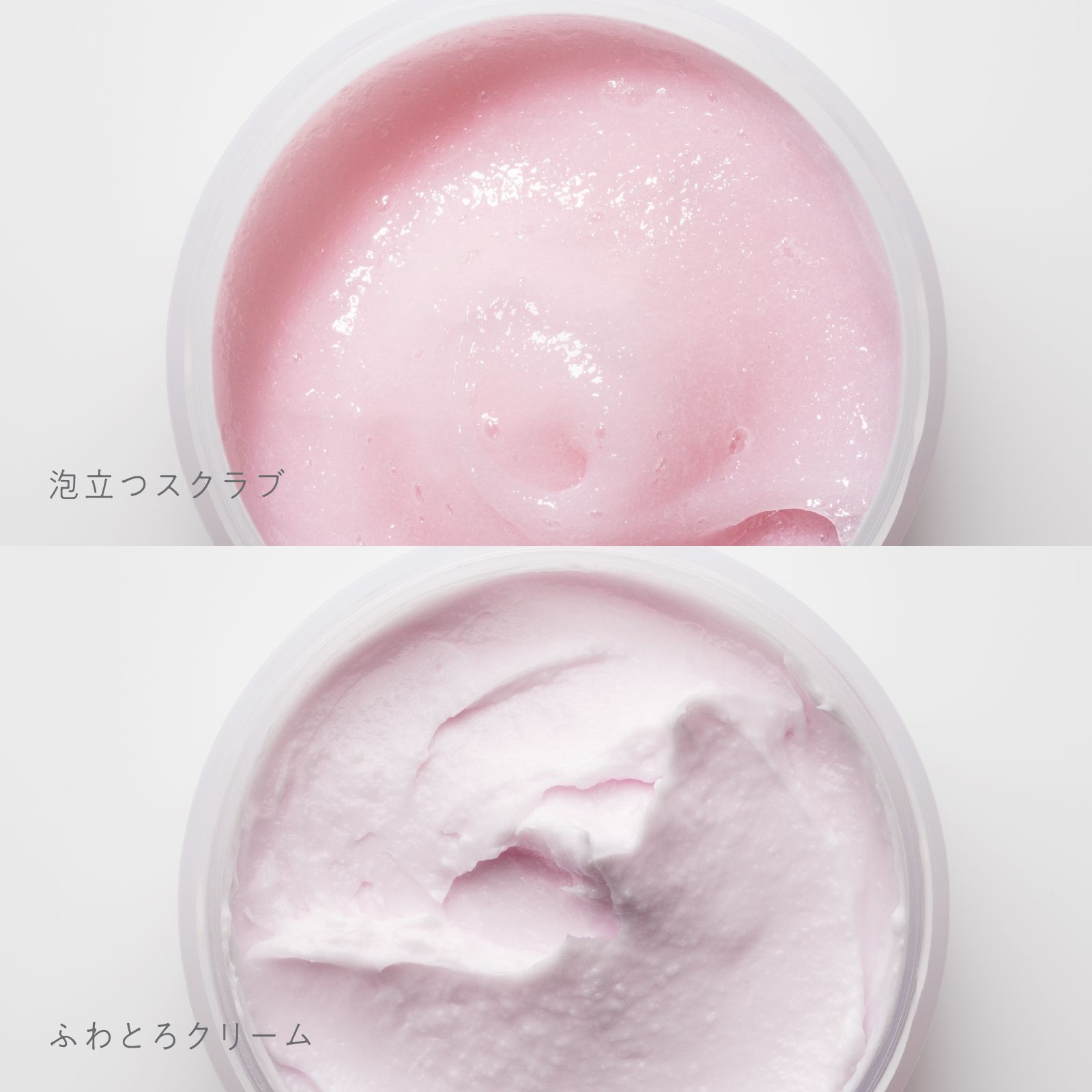 もっちりしたミルクシュガーのスクラブが、肌にとろりとのびて、水を加えるとふわふわの泡にチェンジ。質感の変化と香りを楽しみながら洗いあげ、なめらかで明るい肌へ導きます。